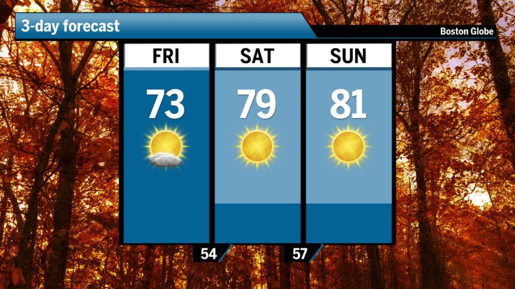 Cuối tuần này, New England sẽ trải qua thời tiết tuyệt đẹp với áp suất cao bao trùm rộng rãi và một xu hướng nắng ấm đẩy nhiệt độ lên khoảng 70 độ vào thứ Sáu, và sau đó là 80 độ vào thứ Bảy và Chủ nhật.